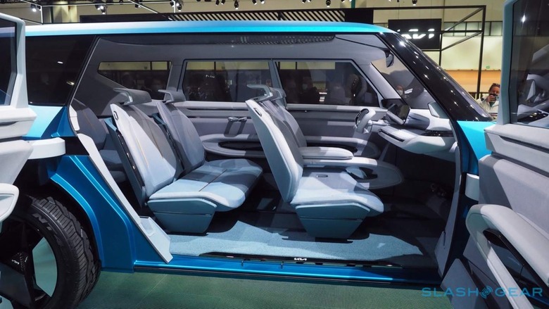 Kia used that opportunity to experiment with some neat features that are refreshing in their practicality. The touch-sensitive HVAC controls that glow through the fabric-wrapped dashboard not only look great, but they don't feel too far from something Kia could actually use in a production vehicle. The same goes for the integrated storage, and the way the seats are mounted which emphasize the benefits of an EV's flat floor.
