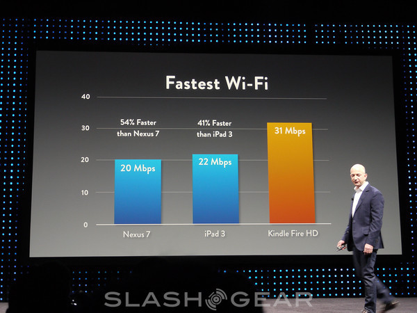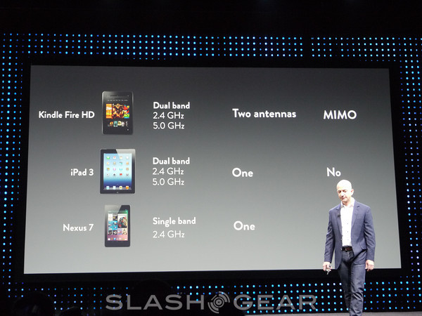Also included inside is a set of antennas, dual-band 2.4GHz and 5.0GHz for faster wi-fi action, and MIMO – MIMO being a technology that only a small number of high-end devices incorporate at the moment. The iPad 3 has just one antenna, as does the Nexus 7, noted Amazon, and only the Kindle Fire HD has MIMO inside of the three. With this technology, Amazon notes that they've got the fastest Wi-fi connectivity in the west – so to speak.