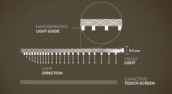 Amazon has released a video showing their team of engineers that've worked on the Amazon Kindle Paperwhite explaining the technology that makes it a top of the line device in the e-reader universe today. What you've got here is sharpness and brightness enough to view in many conditions – but it's more than that. Because it's not optimal to look at a book with the area around the letters shining brightly directly into your eyes, the Kindle crew here has turned the whole show on its head, shining light from the side of the screen across it, down toward the display through a reflecting film layer just 0.5mm thin.