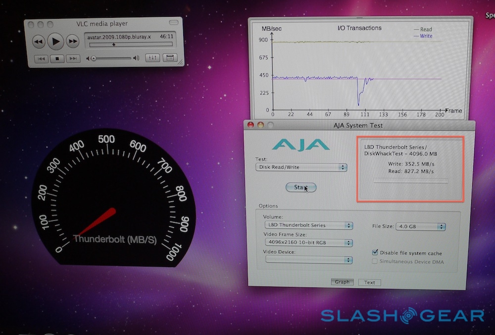 The first demo was a raw speed test, reading and writing to the drives with 4GB files. As you can see in the video, the MBP was able to write at up to 352.5 MB/s, while read speeds reached 827.2 MB/s. The company told us that the same setup had hit 870 MB/s peaks in their own testing.