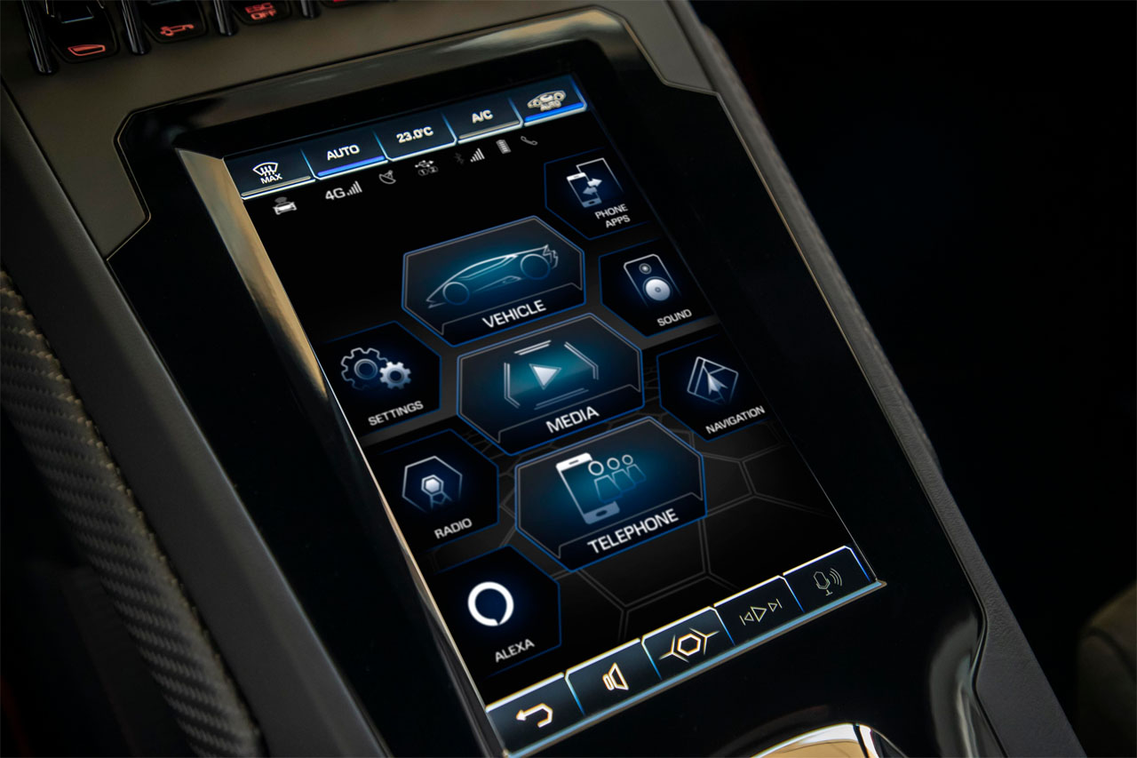 The tech allows owners to adjust in-car functions like climate, lighting, seat height, navigation, telephone calls, and entertainment with Alexa voice commands. Alexa is also integrated with the Lamborghini Dinamica Veicolo Integrata system inside the car. Using voice commands, drivers can access feedback on the driving dynamics using the infotainment system screen, including details on torque vectoring, dynamic steering, and traction control.