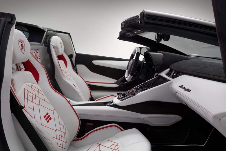 Standard on both limited-edition Aventador S Korean Series models are two trigrams of the Korean flag (Geon and Gam) on the engine compartment and distinct patterns on the hood, doors, and rear fenders. The latter, said Lamborghini, represents traditional Korean window patterns with crisscrossing vertical and horizontal lines.