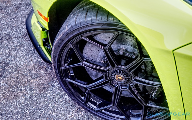 Learn to trust the slick aero, the all-wheel steer, and the sticky Pirelli Corsas, and the Roadster hides its curb weight well. It's a big car, sure, but it blusters past any complaints of that with torque, bravado, and up to three degrees of twist on the rear rubber. The Aventador's seven-speed transmission is clearly outperformed when it comes to smooth-shifting by the dual-clutch system in the Huracán, its jerkiness particularly noticeable at low urban speeds (yes, when all eyes are on you in your "Verde Scandal" drop-top), but its cog-juggling comes into its own when urgency is more important than finesse.