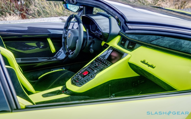 They'll have a fairly regular chance to stretch them, though, since the Aventador SVJ Roadster guzzles fuel with alacrity. Lamborghini quotes 11 mpg on the combined cycle, but I fear the person with sufficient restraint to achieve it. Push even remotely hard and you're down in single-digits and watching the fuel gage drop almost in real-time. No, I don't think the typical owner will care about the cost, but don't expect the clunky infotainment system to help you find gas stations with the super-high-octane juice the V12 demands.