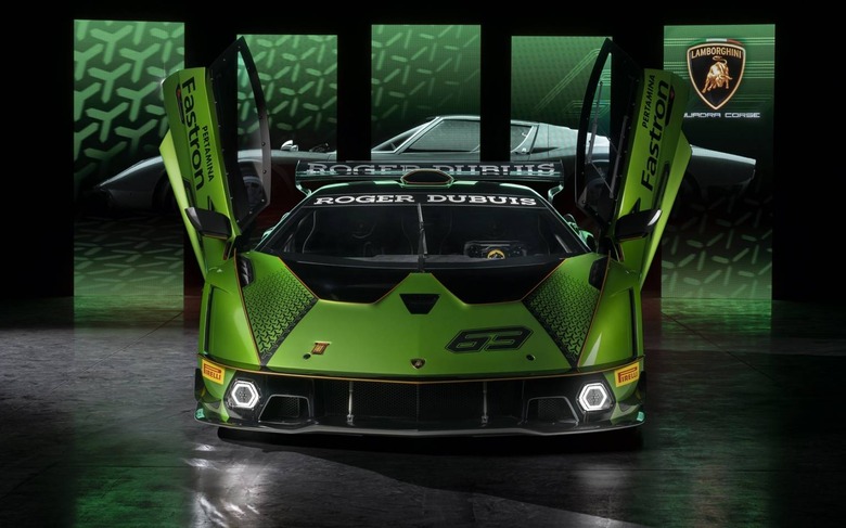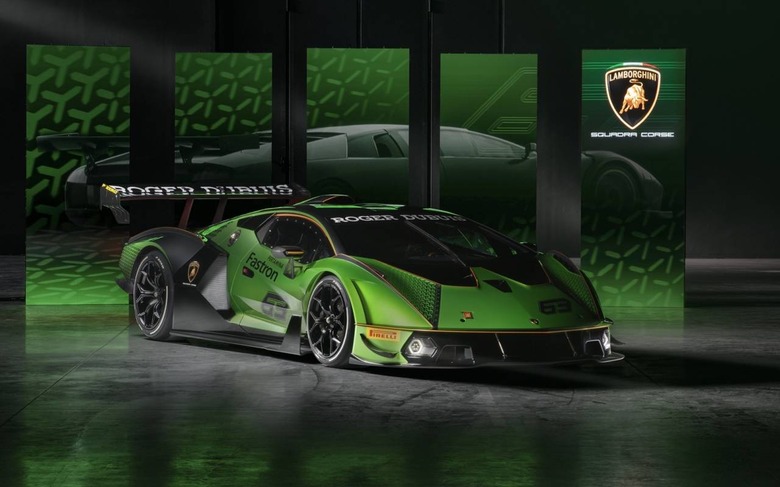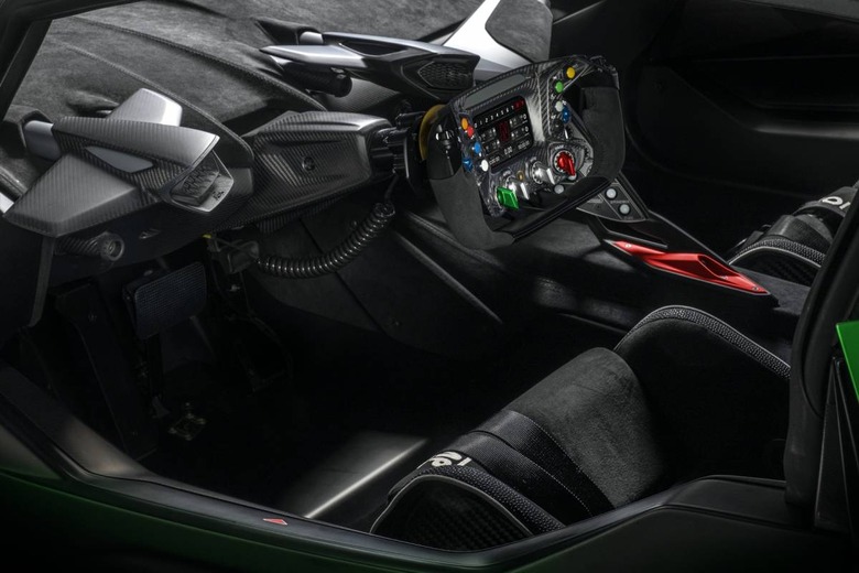 Special Pirelli slick tires are fitted to magnesium rims – 19-inches at the front, and 20-inches at the rear – while Brembo Motorsport brake discs and calipers are used. Inside, there's an FIA homologated OMP seat, with a carbon shell, while the driver gets a multifunction steering wheel with a display that Lamborghini says was inspired by those inside F1 cars. The Y-styling abounds, with the instrument panel and dashboard mounted on asymmetrical carbon frames in that shape, that manage to be both efficiently load-bearing and striking to the eye.
