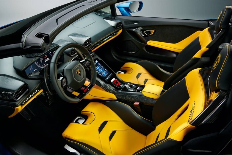In the cabin, there's an 8.4-inch touchscreen in the center console, and a whole range of customization options for the leather and trim. Lamborghini also includes two lateral wind shields, which can help cut down air noise in the cabin.