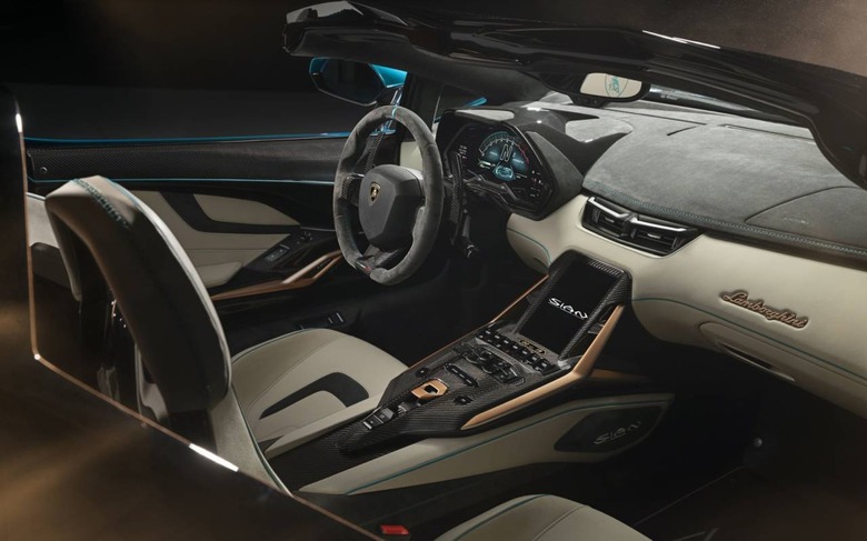 Inside, there's no hood mechanism to worry about, because the Sián Roadster doesn't have a roof at all. Lamborghini has used things like 3D printing for the air vents, along with lashings of leather, Alcantara, and carbon fiber.