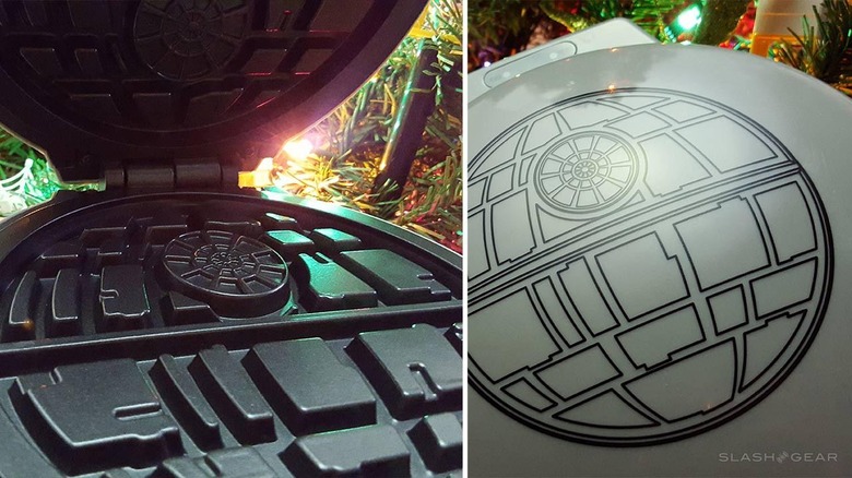 Below our glasses is no less than a Death Star Waffle Maker – NOTICE, on this particular gift, you're going to have to wait. Think of it as a holiday "here's the receipt, expect the gift soon" sort of deal. You'll be making 7-inch wound waffles with two section in February of 2016. This is also a ThinkGeek exclusive.