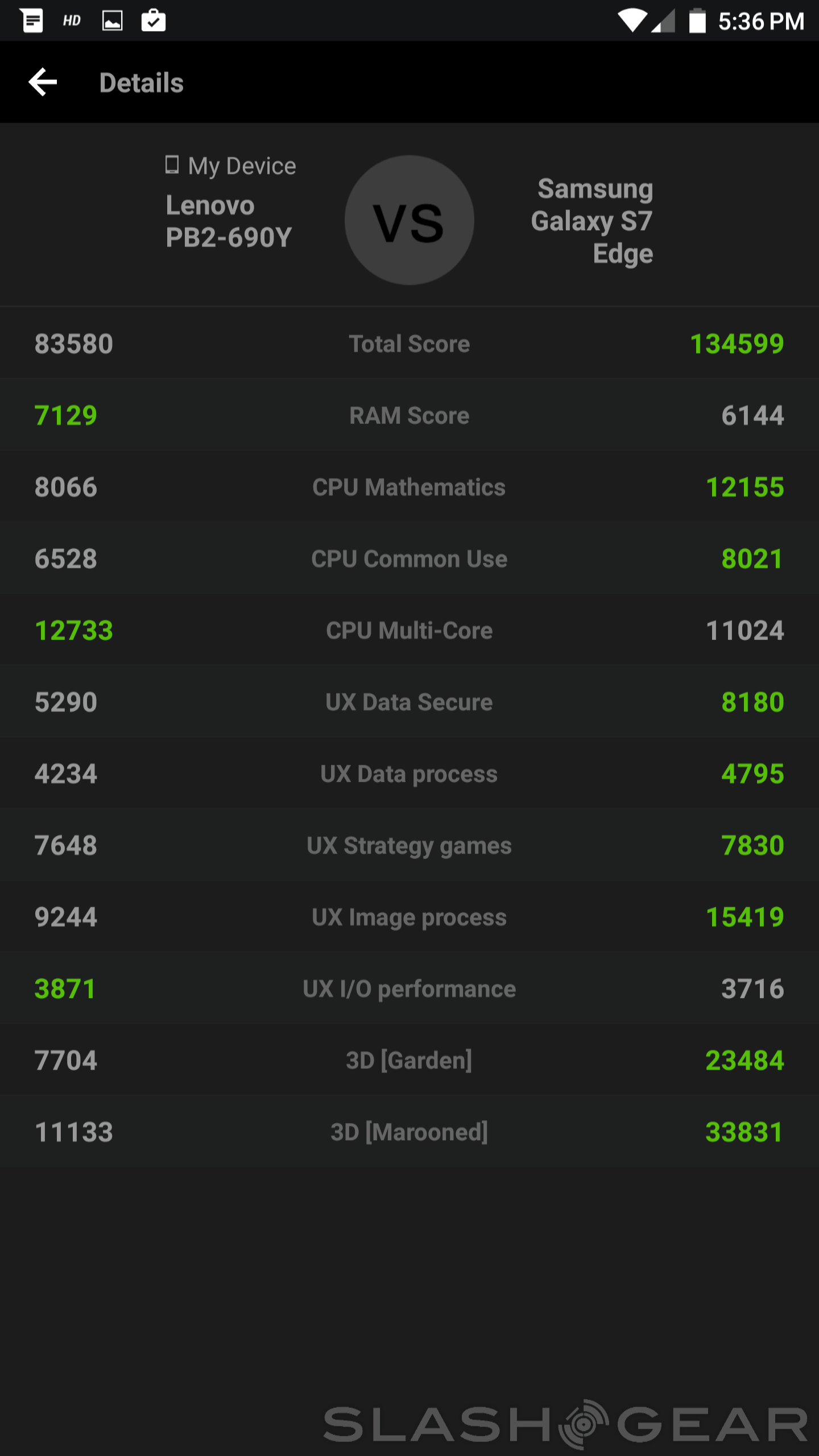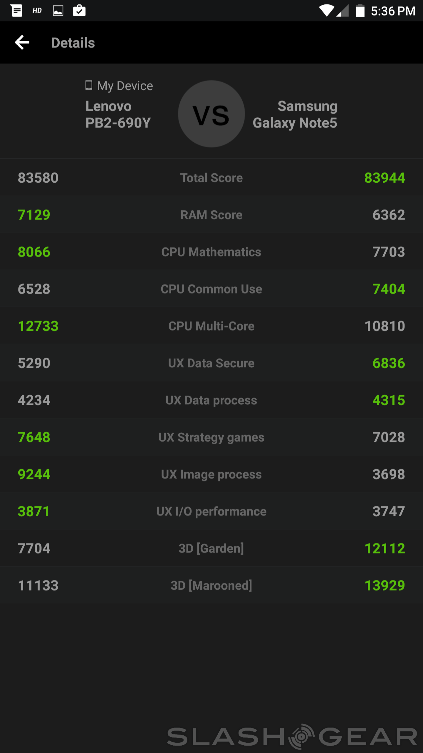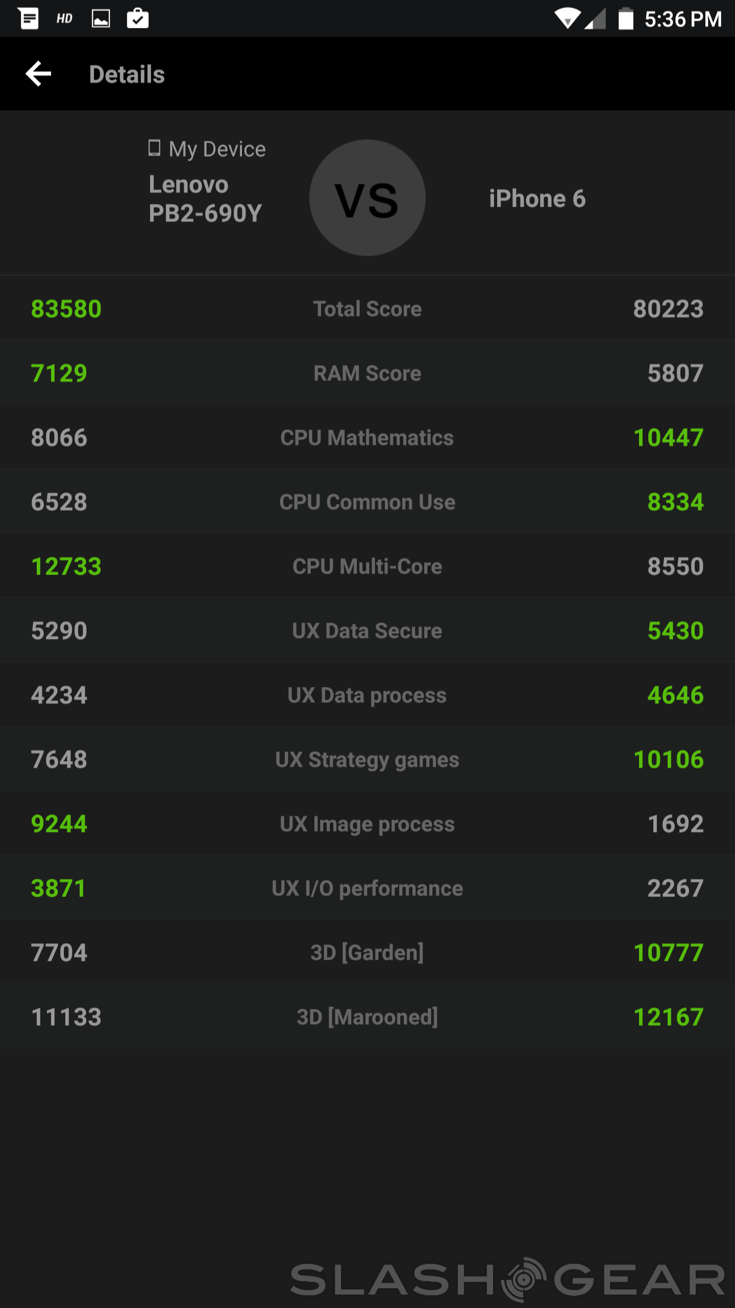 However, internal hardware is where we start running into issues. Running this through Antutu shows us just how middling the hardware is, giving us a score of 83,580. That places the Phab 2 Pro just below the Galaxy Note 5 in terms of overall power, and just above the iPhone 6.