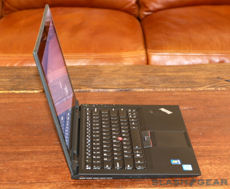 The X1 has a wedge design theme to it that gives it a cutting edge look. Matte black all over, inside and out, the only thing glossy is the Corning Gorilla Glass 13.3 inch HD display (1366 x 766). The design accents on the X1 are minimal. There are chrome Lenovo logos located in the lower left corner when the lid is closed, and in the lower left corner of the screen inside the bezel. The ThinkPad logo is in the lower right corner when the lid is shut, and also on the lower right of the main body below the fingerprint reader. And of course, the usual stickers for Intel Inside, Windows 7, and Energy Star are on there as well. The overall design has a no-nonsense feel. Almost like it should say "Designed exclusively for Darth Vader."
