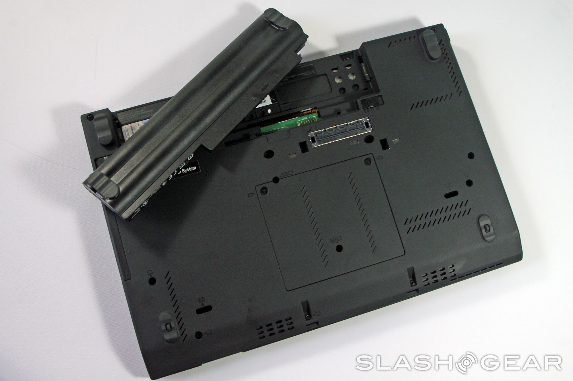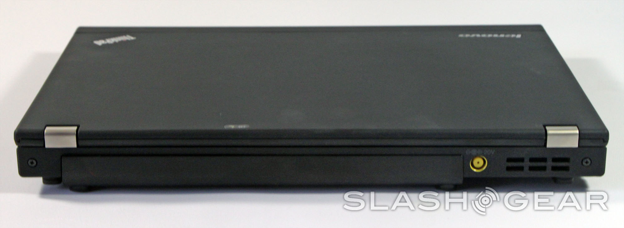 The hinge deserves some attention. Because it's considerably stiff and the laptop is surprisingly light, it's nearly impossible to open the laptop with a single hand without the base rising up. The screen stays where it's put, but I'd much prefer a slightly looser hinge and an old-school latch mechanism, instead of the small lip that's provided. The front of the laptop is bare, while the rear holds just the battery and power plug.
