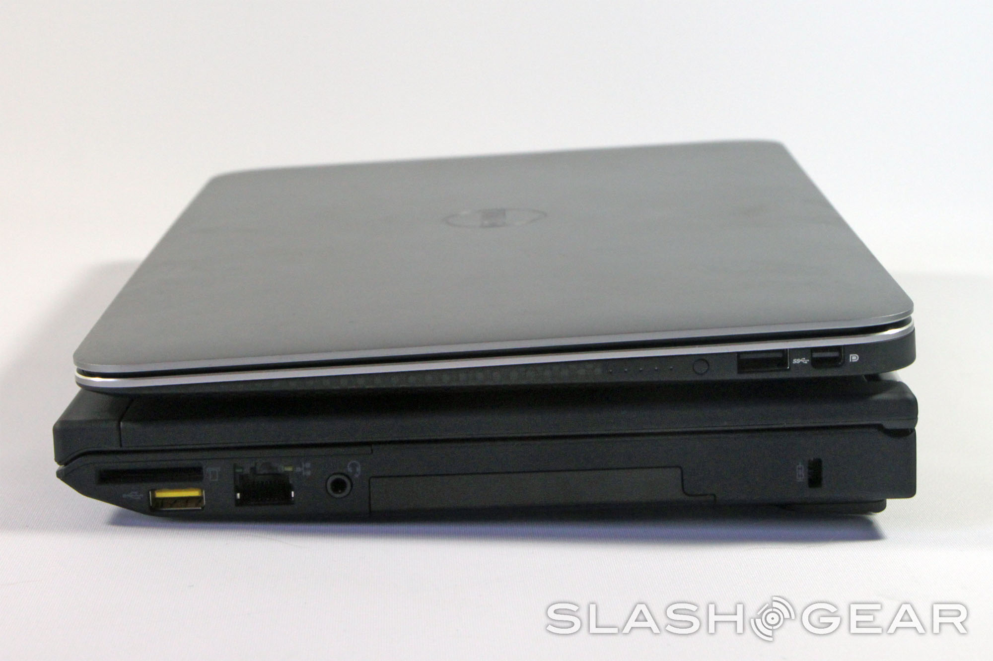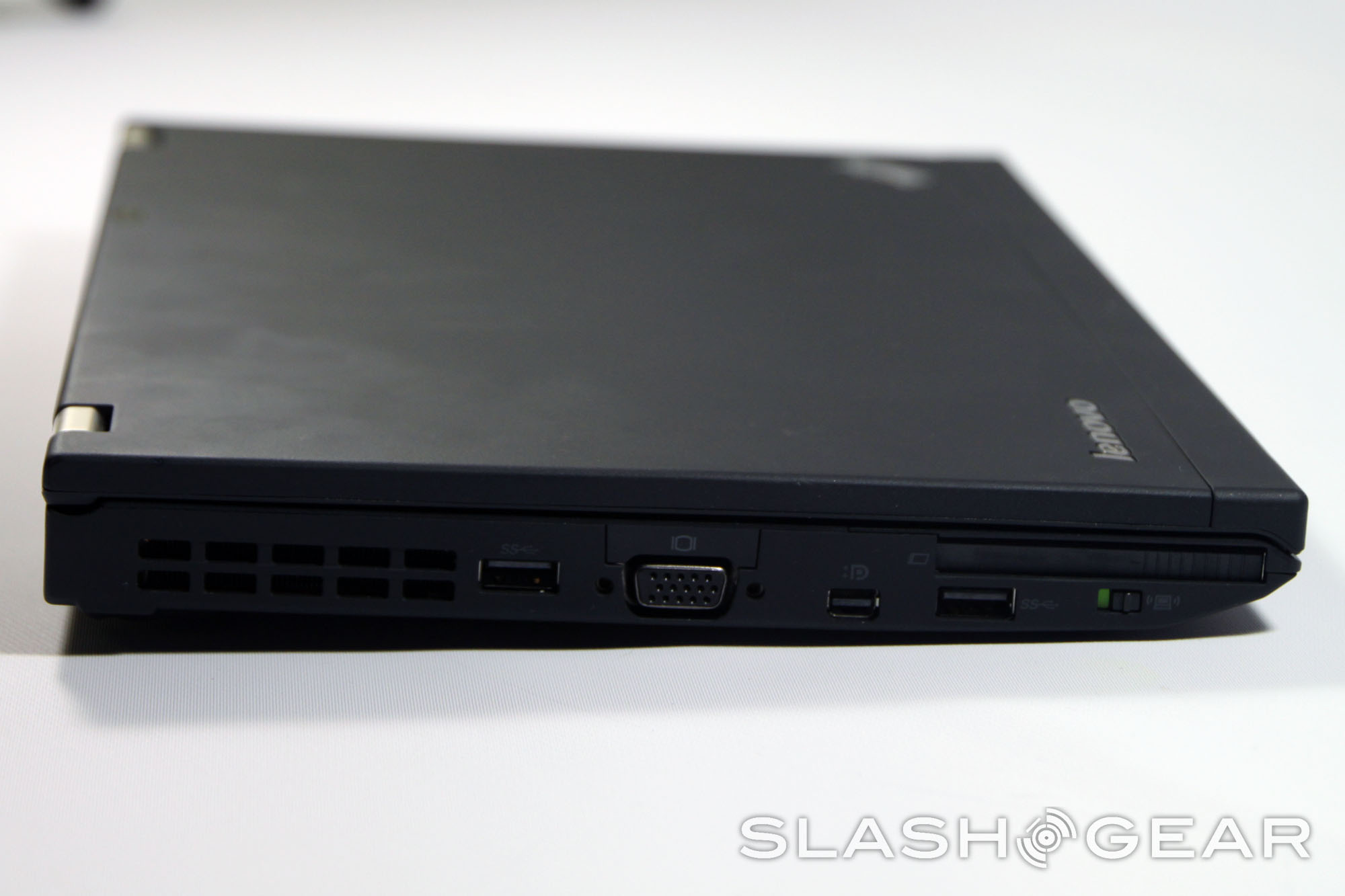 Moving to the left side, we're greeted with two USB 3.0 ports (black instead of the usual blue), a Mini DisplayPort and VGA port for video-out, a WiFi switch and an ExpressCard slot – an addition that marks this as a business notebook first and foremost. On the right side you get a more media-friendly SD card slot, a combined headphone/microphone jack with Dolby certification, an Ethernet jack, a Kensington lock port and a USB 2.0 port. That yellow color isn't just for show: it indicates that the port will continuously supply a charge even when the laptop is sleeping, a very useful feature in the age of smartphones.