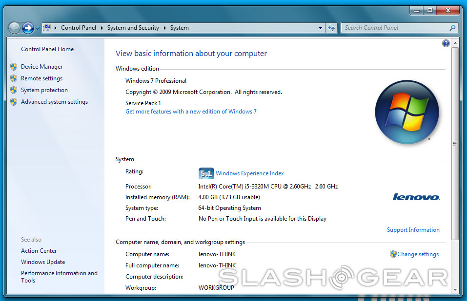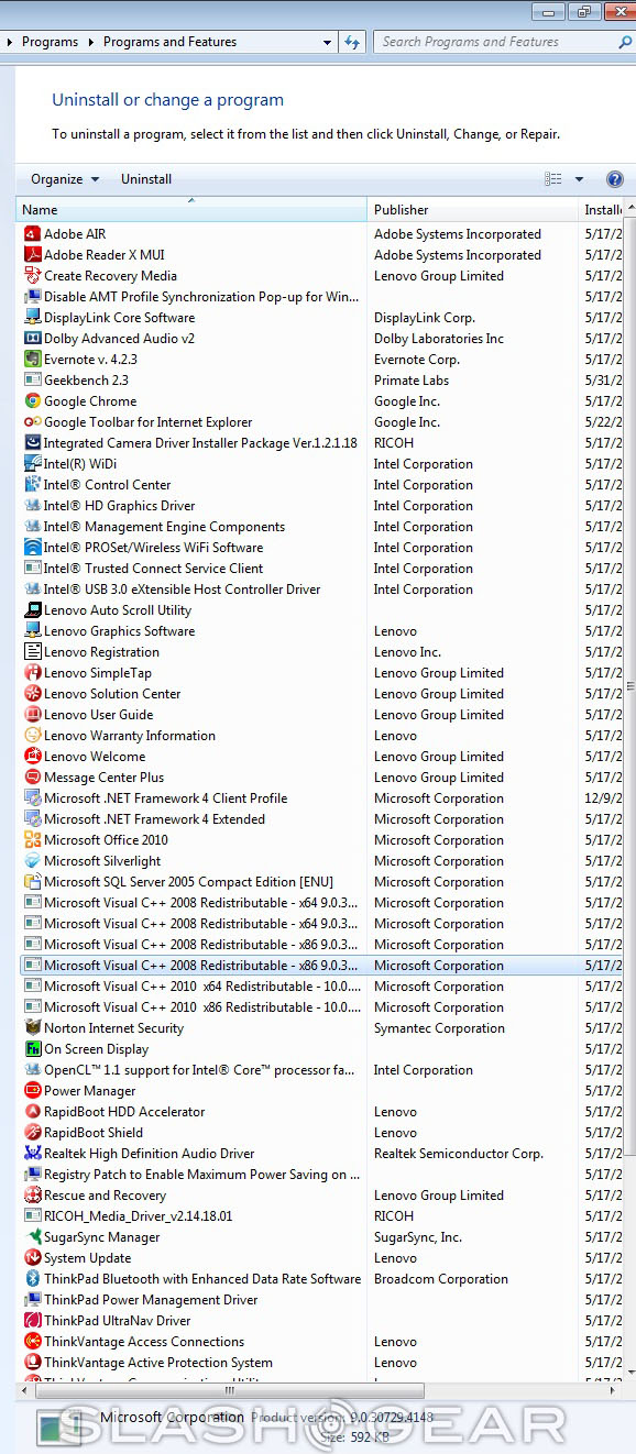 Lenovo keeps its business machines pretty clean when it comes to Windows – well, that's traditionally the case, anyway. There's a few programs here that I'd have installed anyway (Flash player, Google Chrome) and a lot that I wouldn't (Adobe Air, Evernote, SugarSync, Google Toolbar and the obligatory Microsoft Office trial). Lenovo seems to have added quite a few pieces of software that aren't necessary because they're built into Windows – things like a second battery meter.