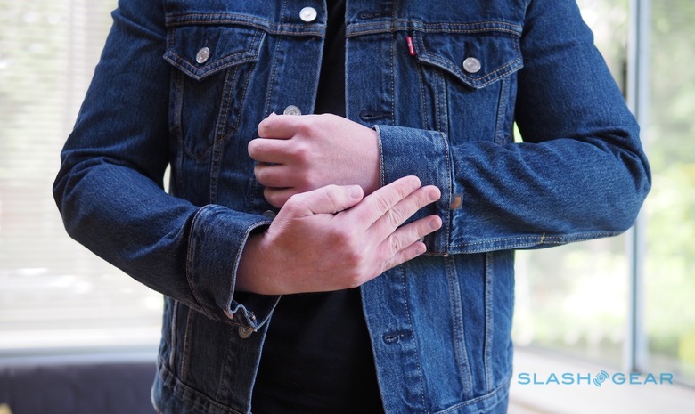 "It's just an authentic piece of denim outerwear," Dillinger says, "that just happens to have this magic discreetly tagged into the cuff." The new tag still has a color-changing LED and a vibration motor for notifications, and it charges via microUSB (not, sadly, USB-C). Removed, the jacket is machine-washable.