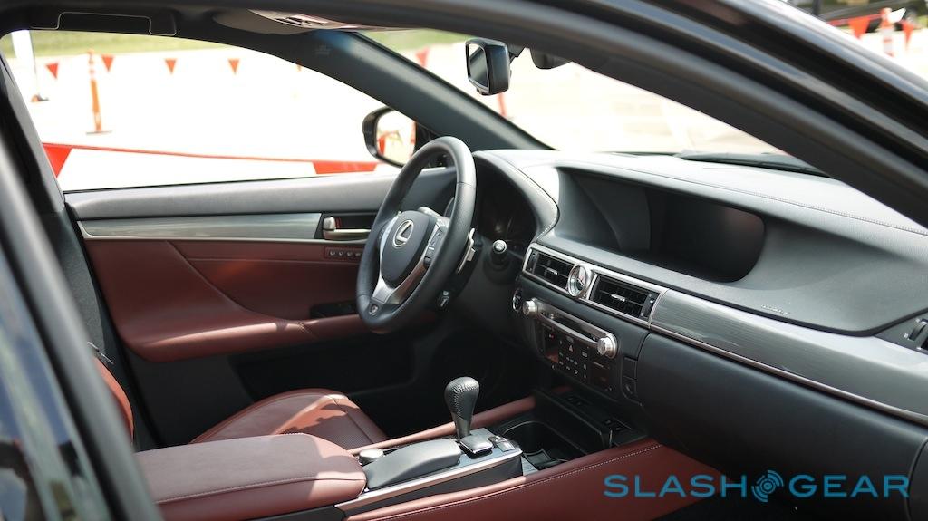 Inside, meanwhile, the GS450h F SPORT cabin wisely bypasses Lexus' tendency toward pale wood, option instead for – in the case of our test car – red leather sports seats, aluminum inserts in the dash and door trim, and perforated black leather on the wheel and shifter knob. The F SPORT logo makes another appearance on the scuff-plates front and rear, and there are pleasingly snicky little paddles behind the wheel for when you don't want to let the CVT gearbox do its thing automatically.