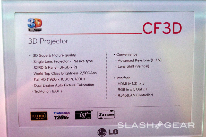 LG's 2010 LCD range wasn't the only place 3D cropped up from the company. MMtech Online stopped by to take a look at their new 3D projector, the LG CF3D, which can produce a 3D image from a single projector rather than requiring separate left and right images. What's really interesting is the price: unlike previous systems, LG's have a consumer focus and will be priced at around $10,000.