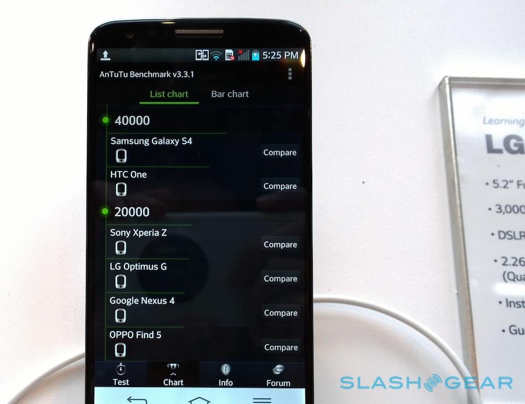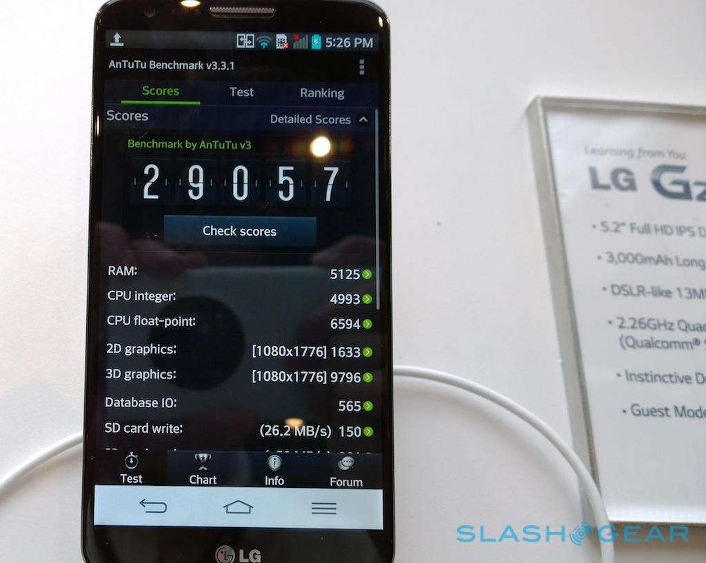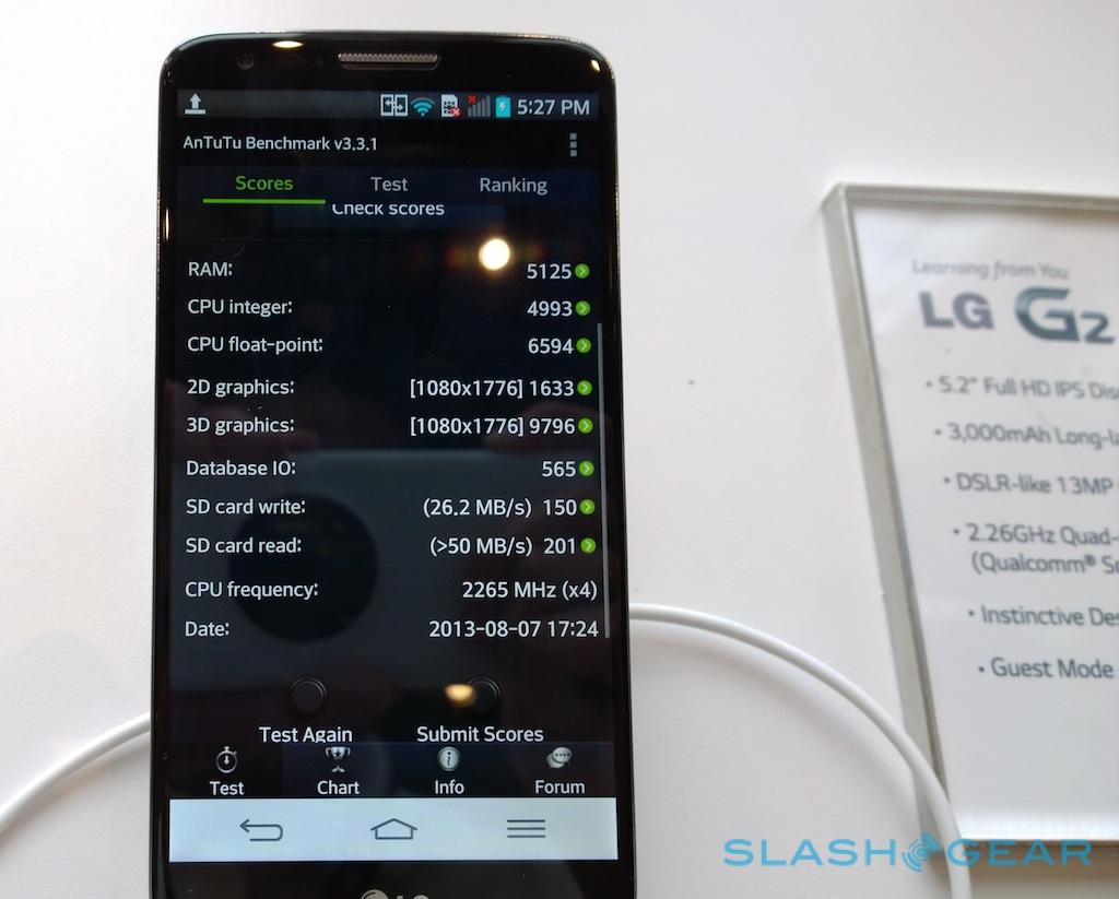 Update: We had the opportunity to run some preliminary benchmarks on the G2. Now, it's important to remember that this is unfinalized software and hardware, so don't draw too many conclusions from the numbers beyond "this is a fast phone". We'll have more solid impressions to share in our full review with a production device.
