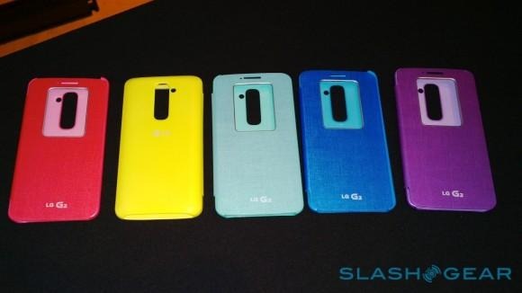 LG has "borrowed" Samsung's windowed case from the Galaxy S 4, for its own LG G2 Quick Window Case, complete with a small opening in the cover-flap. It's a bigger window than Samsung uses – portrait, rather than landscape – and LG describes it as giving a "small phone in a phone": you can see time, date, and weather; interact with calls, messages, and alarms; and control your music playback. One advantage over Samsung's is that, thanks to that big cut-out, you can still use the G2's camera when the cover flap is folded all the way back, rather than having it dangle. LG will offer the Quick Windows Case in seven colors, and users will be able to switch background images as well as pick between analog or digital clocks.