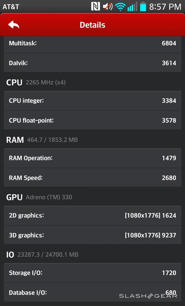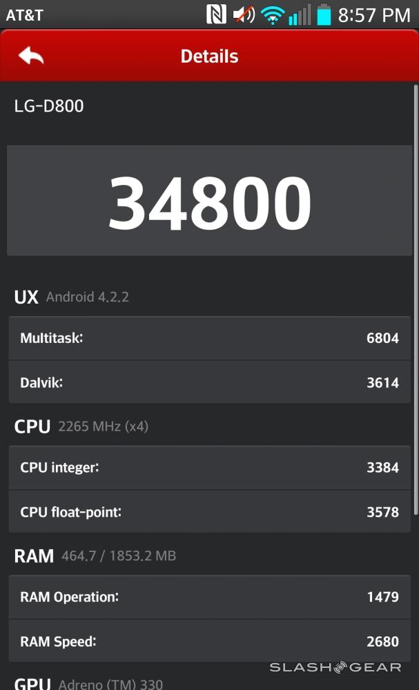 In Quadrant, the LG G2 destroys all but a select few processors on the market today. In one case we knocked out a score of 18969 (total) while a test of NVIDIA SHIELD and its NVIDIA Tegra 4 quad-core processor scored an 18696 (total). It's not entirely fair to compare SHIELD to the LG G2 simply because they've got an entirely different number of pixels to work with (SHIELD sits at 720 x 1280), it's striking how similar these processors are scoring, especially given the massive space between them and the previous generation SoCs.