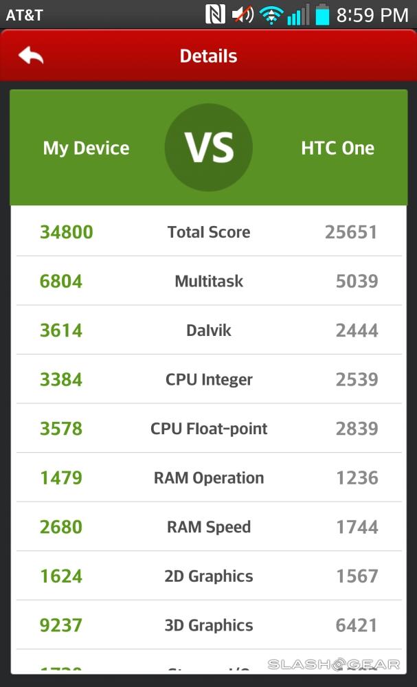 The benchmark known as AnTuTu features a relatively new 1-vs-1 comparison chart with highest results from a variety of devices. Here you'll find the LG G2 taking the HTC One, Samsung Galaxy S 4 (both of them with a Qualcomm Snapdragon 600 quad-core SoC), and a Sony Xperia Z (with a Qualcomm Snapdragon S4 Pro) to lunch.