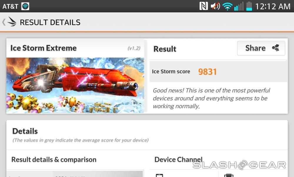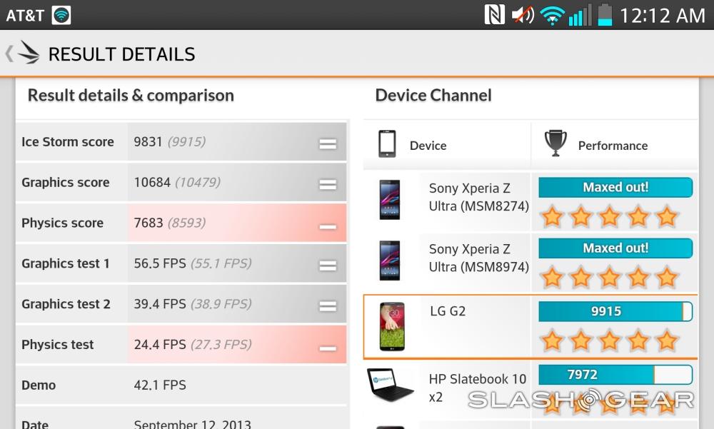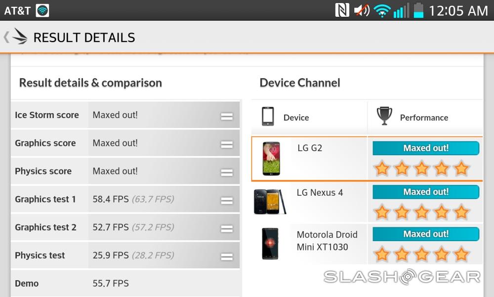 Finally there's 3D Mark, the self-proclaimed Gamers' Benchmark. According to 3D Mark, the standard Ice Storm test is not able to display the true processing power behind the Qualcomm Snapdragon 800 inside the LG G2: it's too powerful. Ice Storm Extreme produces similar results, showing the Sony Xperia Z Ultra, it also running a Snapdragon 800, to be maxing out – meanwhile the LG G2 is the highest-powered device on their charts for this test just below the Xperia Z Ultra.