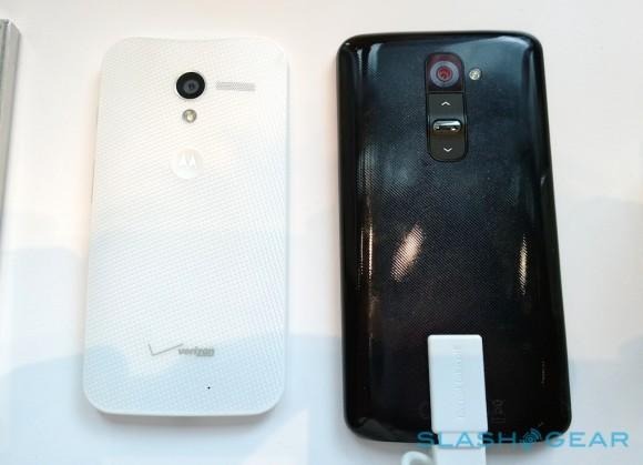Both the Samsung and LG devices work with embedded IR-blasters for controlling your TV set and other infrared devices while the Moto X does not. The Samsung Galaxy S 4 has a removable battery while the battery on the Moto X and in the LG G2 is embedded. While pricing remains unknown on the LG G2, the Moto X and Samsung Galaxy S 4 can cost as little as $199.99 connected to a 2-year contract.