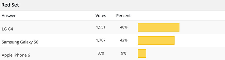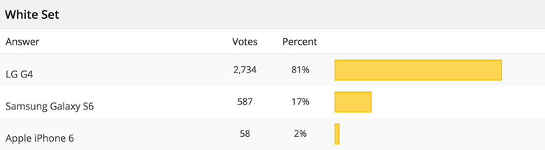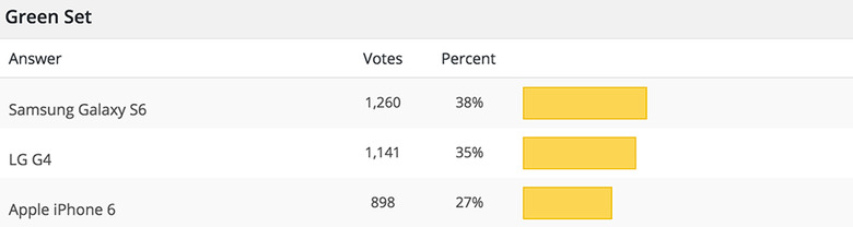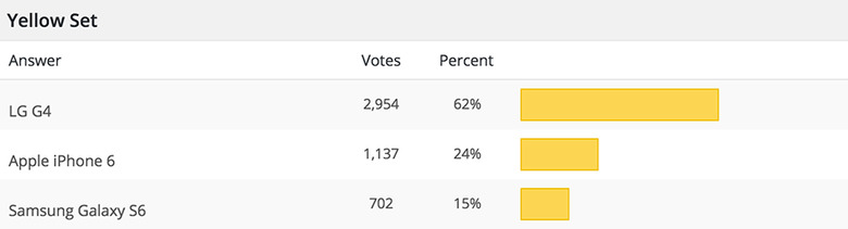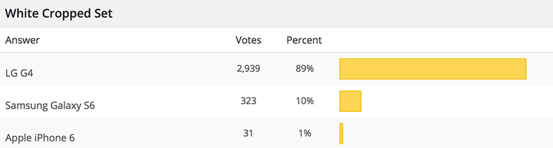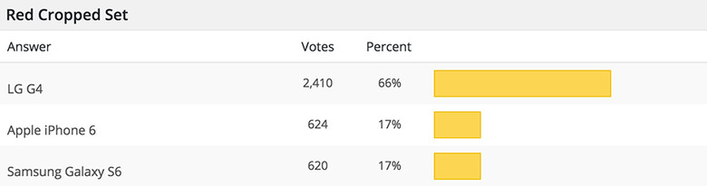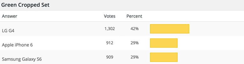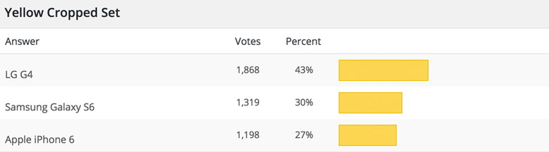 The first photos in this set were taken under yellow lighting with an incandescent bulb. Here you'll see the LG G4 winning by more votes than the other two options combined. The iPhone also takes a solid second here with the Galaxy S6 over 400 votes ahead.