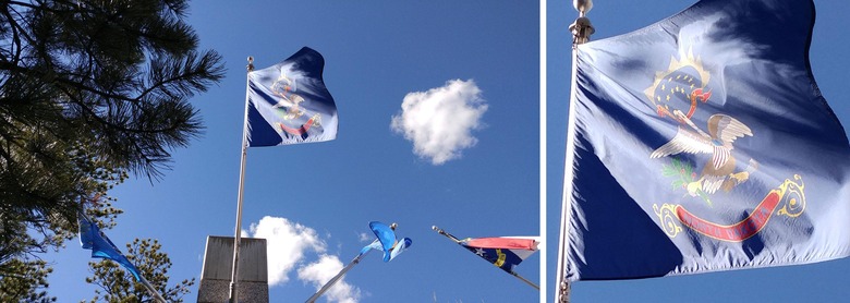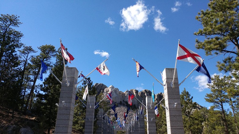 Flags along the path to the landmark viewing spot at Mount Rushmore represent the 50 United States. Here we've photographed North Dakota.
