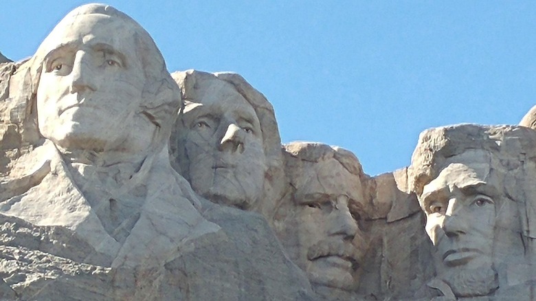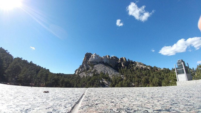 As it is in the hero image of this article, this photo shows the flags on the path to the viewing spot, and the carvings of four American presidents on the mountain.
