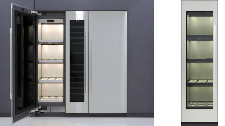 The column-type indoor gardening appliance uses various technologies to replicate outdoor conditions inside its large cabinet. LED lights, forced air circulation, and wick-based water management all adjusts to match temperatures and conditions depending on the time of day. It's like having your own little world and climate inside.