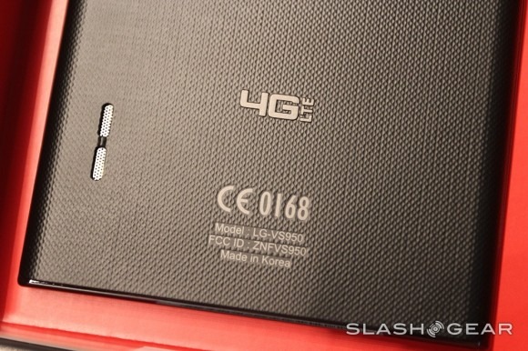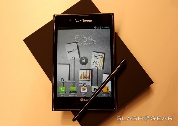 What you've got here is a rather boxy look at the smart device that, though it's not the most elegant smart gadget on the planet, it certainly does appear and feel unique here in 2012. LG's recent efforts have been in devices that have rounded corners and odd shapes – like the LG Lucid with its smooth back and tiny size. There's also the LG Nitro HD with one of the most high-definition display-having devices on the planet at this very moment and a rubbery grip back. What we've got here with the Intuition, on the other hand, is a beast with a pen – a "Rubberdium" pen – and another rubbery grip back so you can hold tight!