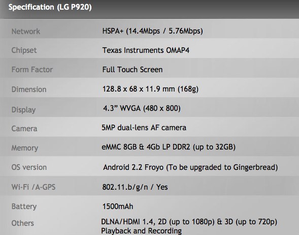 1GHz Dual-Core Dual-Channel processor (Texas Instruments OMAP4) 4.3-inch 3D WVGA screen 8GB memory and 4Gb LP DDR2 1,500 mAh battery