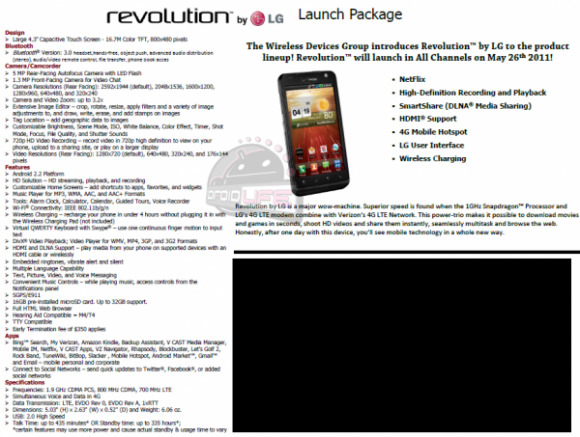 The guys at DroidLife got a hold of a two-sided ad sheet for the LG Revolution 4G that shows the device will be released alongside the DROIDX2 and Xperia Play on May 26th. The device hasn't changed much since it was first revealed. It will sport a 4.3-inch WVGA touchscreen, 5-megapixel camera with auto-focus, single LED flash, a 1.3-megapixel front-facing camera for video calls, WiFi, Bluetooth 3.0, GPS, HDMI, and DLNA.