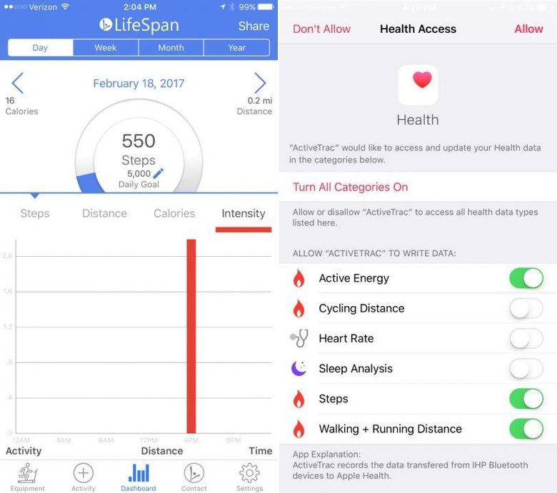 Those sessions can be logged in LifeSpan's companion ActiveTrac app. In the center of the standing desk's front edge there are the controls for the treadmill itself: speed, stop, and emergency stop with a cord to clip to your shirt or belt in case you fall off, and a basic display to show calories burned, distance walked, and steps counted. There's also a sync button: press that, hold your iPhone near, and all of your data is shuttled over to your smartphone. ActiveTrac can share your data with Apple Health, too, including steps, walking and running distance, and active energy exerted.