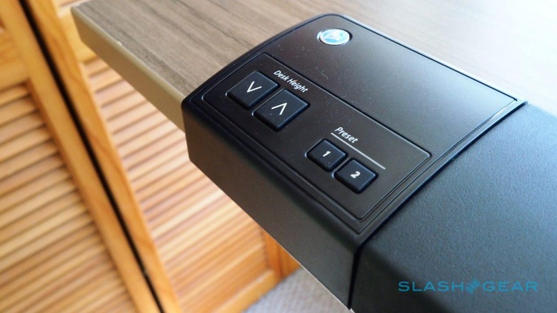 In the case of the $1,749 TR1200-DT7 specifically, the desk is a power height-adjustable model that can motor up and down between 27.5-inches and 50.5-inches. It stands on two silver-finish legs, and controls on the left side handle height and two memory presets: press them, and then desk shuttles up or down to suit.