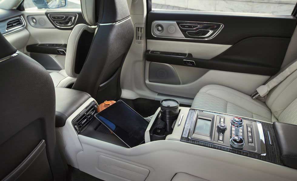 Lincoln figures the car will gain as much as 150 pounds compared to a standard Continental. The center seat in the rear bench is replaced with a big center console. That leaves two large chairs on each side. The center console has tray tables, a tablet holder, and other tidbits.