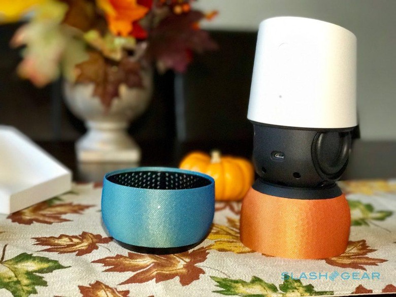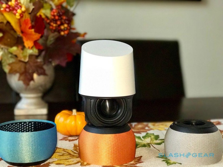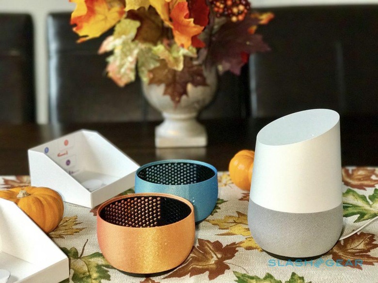 If Amazon's Echo is a vaguely ominous totem, Google Home opts for a more curvaceous, less threatening design. It's a little like an essential oil defuser, only one with interchangeable base sections. Screw apart the two halves – they cling together magnetically – and you can switch out the lower grille for different colors like the pumpkin-orange shown here, or various metal and fabric finishes.
