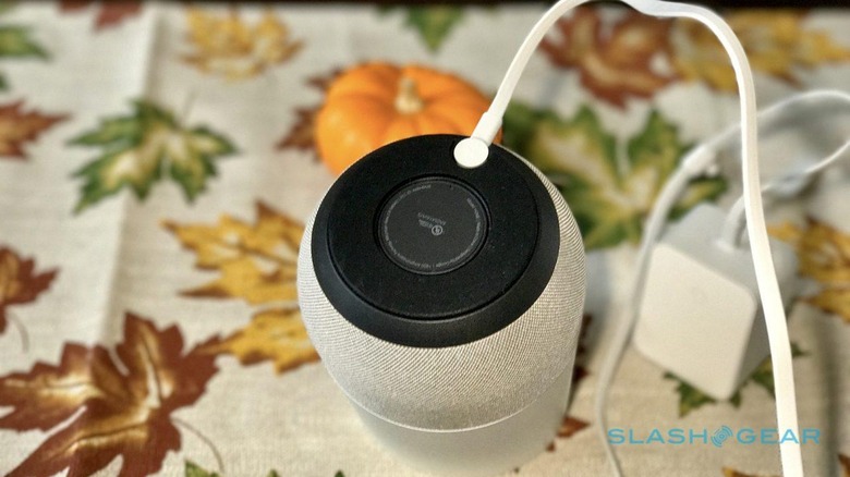 Inside, there's a 2-inch driver and twin 2-inch passive radiators, while on the bottom there's a socket for the power adapter. Despite embracing USB Type-C on the Pixel and Pixel XL, Home relies on a proprietary power plug, and there's no battery option for entirely wireless use. Slide your finger in a circle clockwise or anti-clockwise on the angled top, and you adjust the volume.