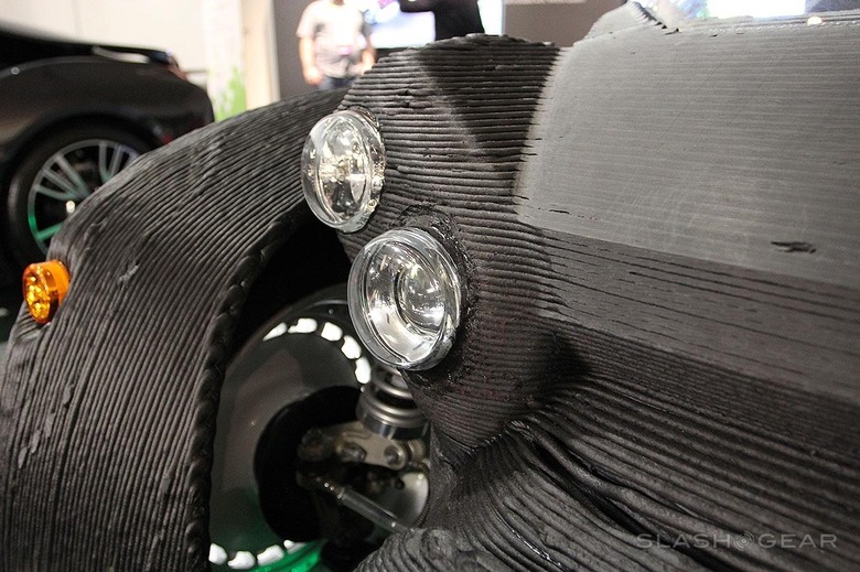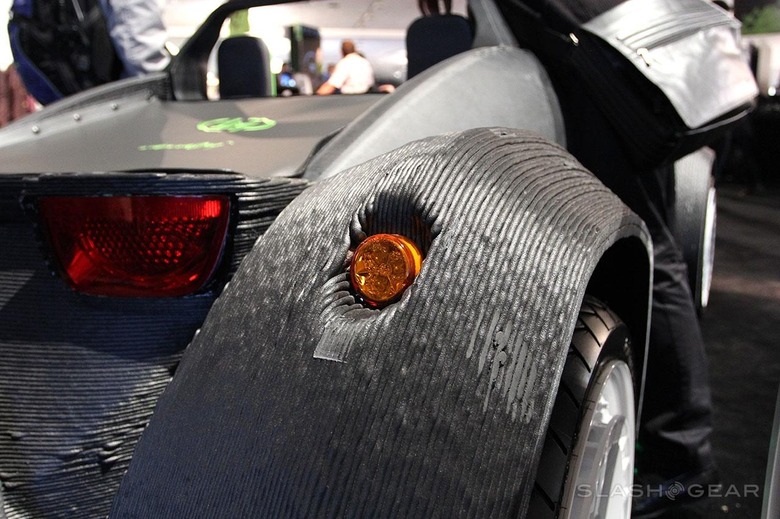 The 3D-printed parts of this vehicle have been printed with ABS plastic that's reinforced with carbon fiber. Material for the experimental process was donated to Local Motors by SABIC. Local Motors suggests that "everything on the car that could be integrated into a single material piece has been printed.