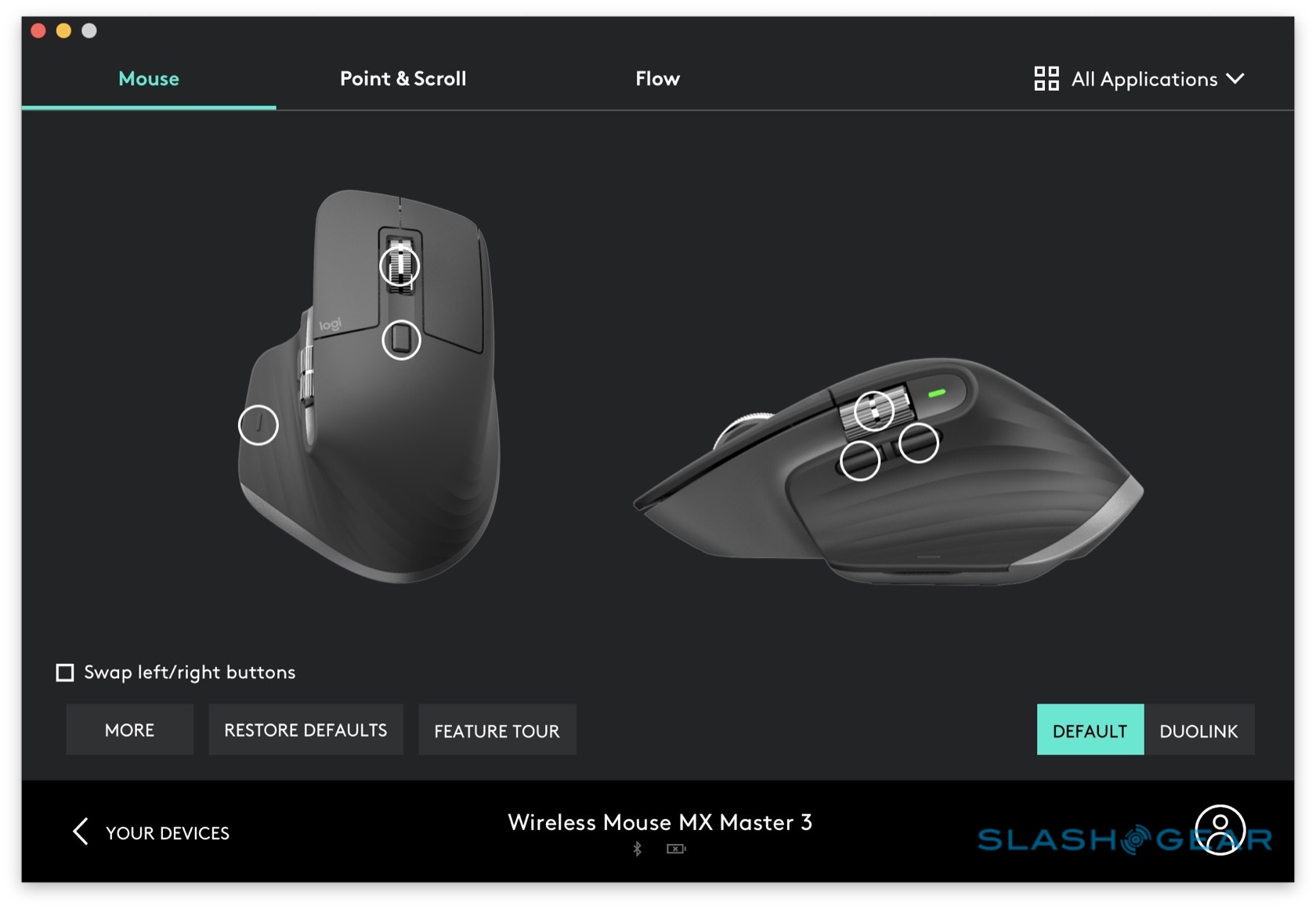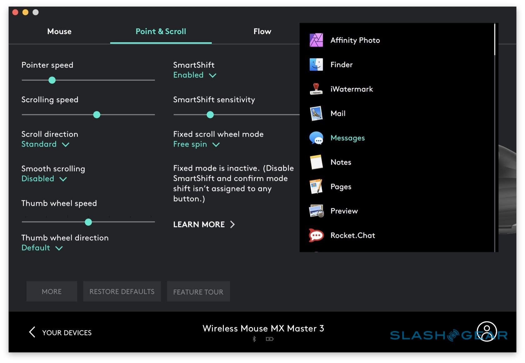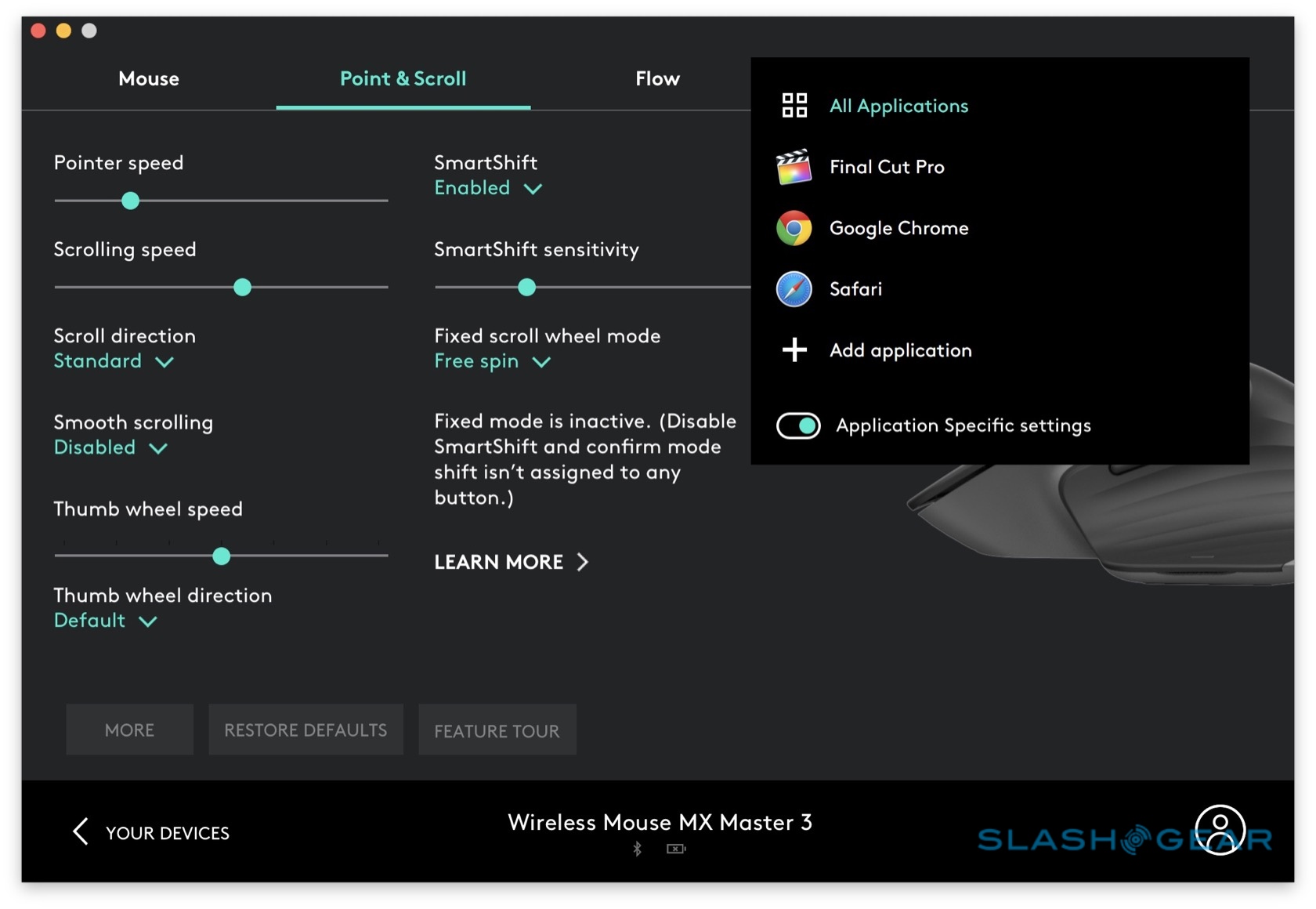 The result is a default preset of the most common configuration for apps like Safari, Word, and Excel. You can change them, of course, but they provide a good starting point. In Safari, for example, the thumb wheel steps through your open tabs; in Word, though, that same control handles zoom. When you first install the Options app – which can save your presets to a Logitech account in the cloud – it scans for which apps you have installed that it has presets for; you can then modify or disable them, or create your own.