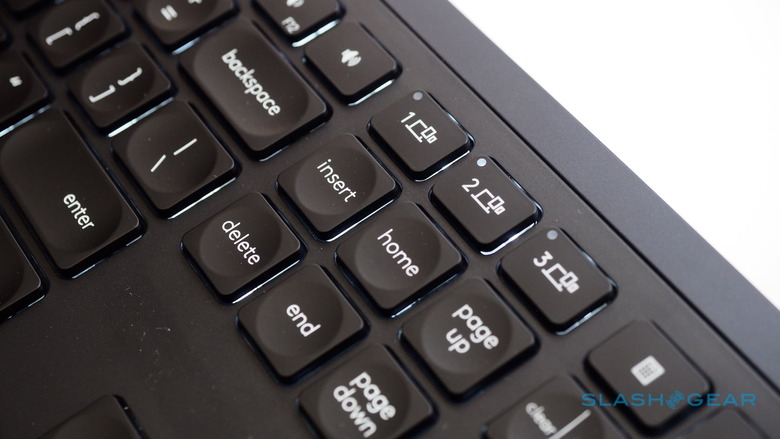 There's backlighting, as you'd expect, using both an ambient light sensor integrated into the status LED on the top right, and a new proximity sensor. That spots when your hands are getting closer and then wakes the keyboard before you even touch a key. It means you're connected and ready – either via Bluetooth or the bundled Logitech Unified Receiver, just as with the MX Master 3 mouse, and with pairing for three devices supported – as soon as you start typing, without any lag or delay.