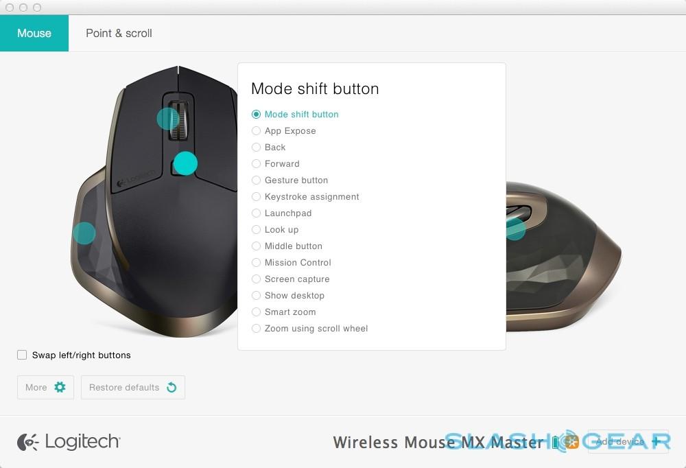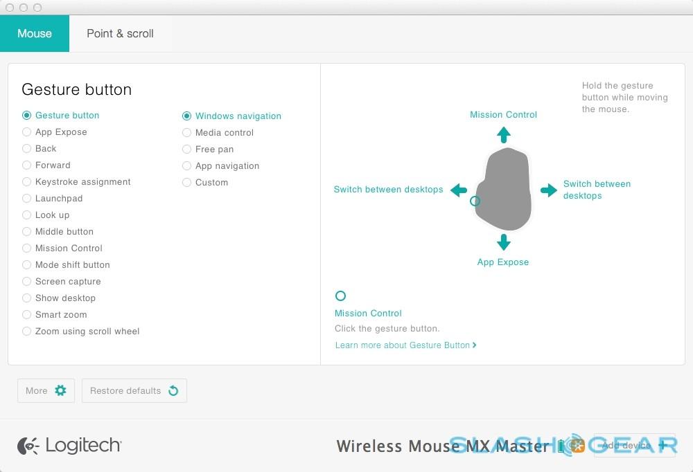 Logitech claims to have solved that, with the addition of what it calls a "gesture button" that sits under your right thumb. Click that, and you get a Mission Control view of all the open windows in OS X; hold it, and you can drag down for App Expose, or left and right to switch between desktops.