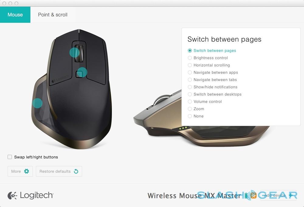 Good news, then. By shifting left/right navigation to the secondary wheel, the MX Master suffers no such wobble. In fact, the speed-adaptive scrolling is astonishingly tactile, and it only took a few seconds of familiarization before I was alternately switching between precision movement down documents and flying through them. When you tap the wheel to stop it, it happens instantly, complete with a pleasingly mechanical click.