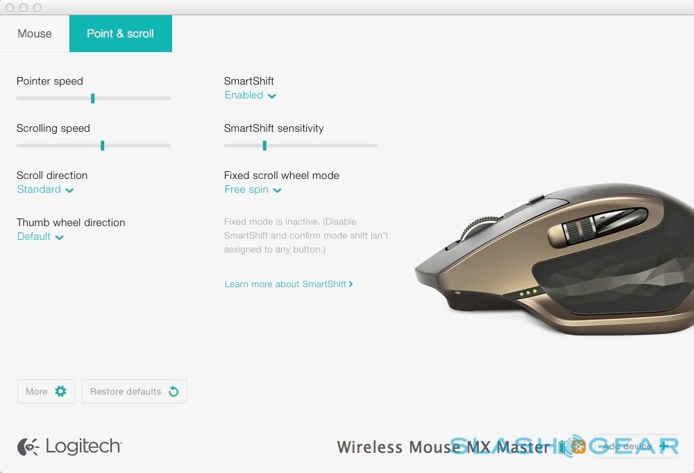 Perhaps most exciting for the Logitech-faithful, however, is the speed-adaptive scroll wheel on top. Rotate it slowly, and it clicks through line-by-line; spin it more vigorously, and the notches magically disappear and it whizzes through freely.