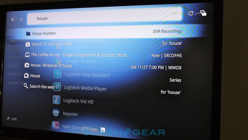 Google is known for search, and so unsurprisingly Google TV makes heavy use of its search bar. Hit the dedicated button on the remote, and you can search through current and upcoming programs, channels, web content and online video. It's fast and it works, for general navigation, surprisingly well. Since Google TV knows what's showing on the channels you receive, you can type in a show name or a suitably notable detail – a team name for a sports game, for instance – and it will automatically flick over using the IR blaster. If you've a DISH DVR it will also pull up any recordings on that STB as well.
