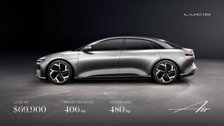 In return you'll get what Lucid expects to be 406 miles of range from the standard battery. As for power, there'll be 480 horsepower, Lucid says; there'll be a single motor configuration as well as a dual-motor option that adds all-wheel drive to the electric car.