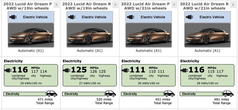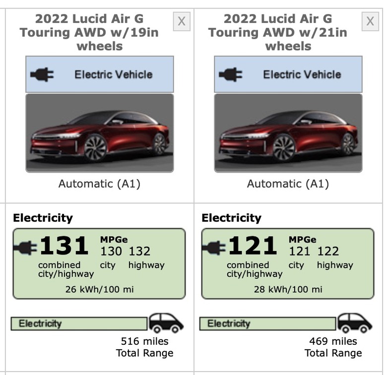 The EPA also weighed in on range ratings for the 2022 Lucid Air Grand Touring, which will be a more affordable version of the car. That will be capable of 516 miles of driving when equipped with 19-inch wheels, or 131 MPGe. With the 21-inch wheels, you're looking at 469 miles, or 121 MPGe.
