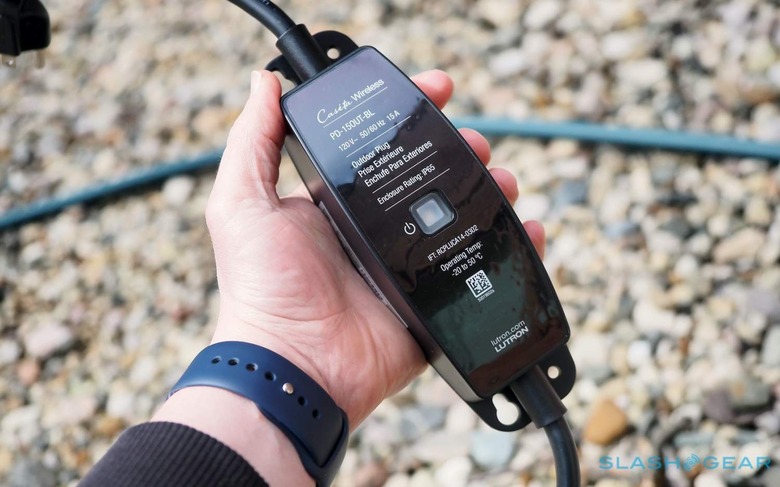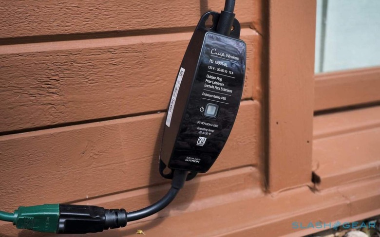 The front gets a single button for power: press it once, the connected device turns on, and a green LED lights up to show current status. Of course, the whole point is that you don't have to go outside. There, depending on what existing Caseta hardware you have, the experience varies.
