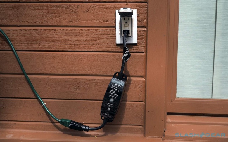 On one end there's a roughly 5-inch cord with a three-prong outlet, and on the other there's a 7-inch cord with a three-prong plug. Lutron opted for reassuringly thick cables, though that does limit how much you can bend them, which could make mounting a challenge. I ended up leaving the whole thing dangling from my outdoor GFCI-equipped outlet – it wasn't too heavy to pull the plug loose – though you could add screws for wall-mounting if you preferred, and Lutron has an optional wall-mounting bracket and a pedestal as alternatives.
