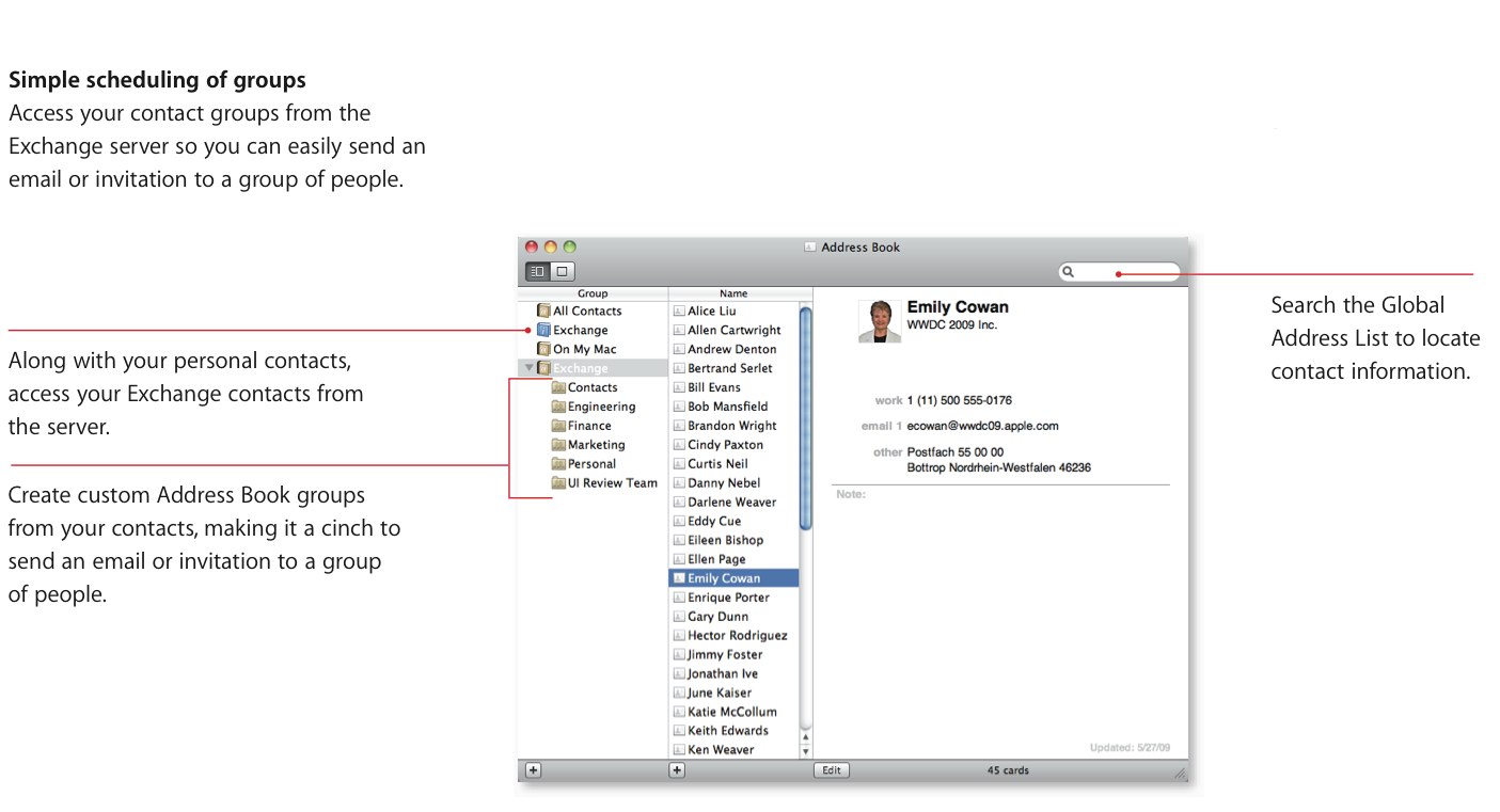 Setup proved straightforward, with Snow Leopard supporting Autodiscovery for those Exchange Server 2007 systems that have it enabled. The general look of Mail and iCal is unchanged, they simply now integrate Exchange information alongside personal accounts; calendars, for interest, can be shown altogether or individually, while Exchange shows up as a new entry under Mail's Inbox heading. Notes and tasks are also handled in Mail, as are server folders, and of course Spotlight searches and Quick Look previews work just as well on Exchange messages as they do on personal ones. The Address Book retains its simplistic three-column layout, only with Exchange listed as a new group; you're also able to create custom address groups, which are then synchronized back to the server.